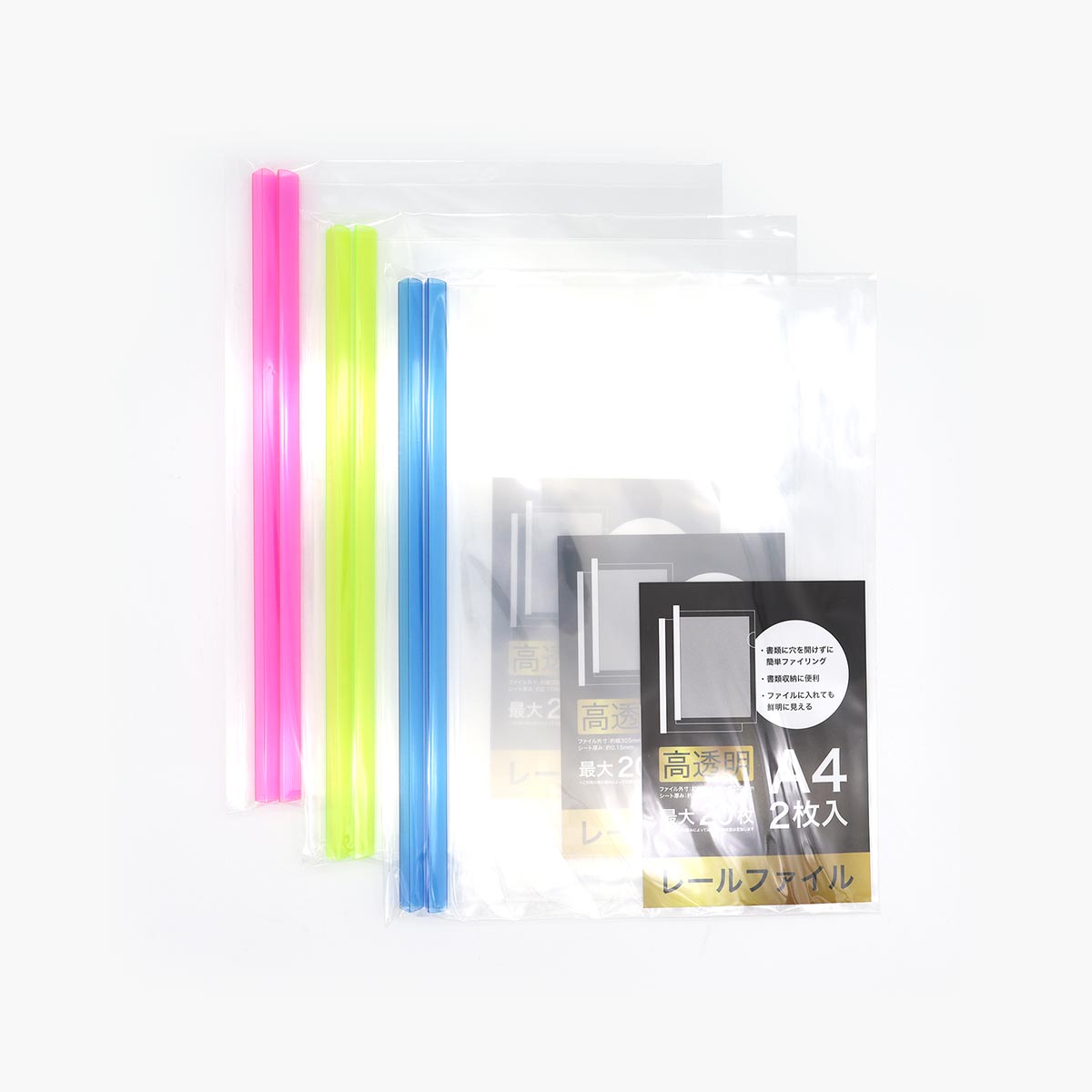 A4サイズの書類に使用できるレールファイルです。クリアホルダーと比べると書類が落ちにくく、ホッチキスを使用せずに書類を冊子のように閲覧することができます。また透明度が高いため、ファイルに入れても書類が鮮明に見えます。最大20枚までのコピー用紙を収納することができます。