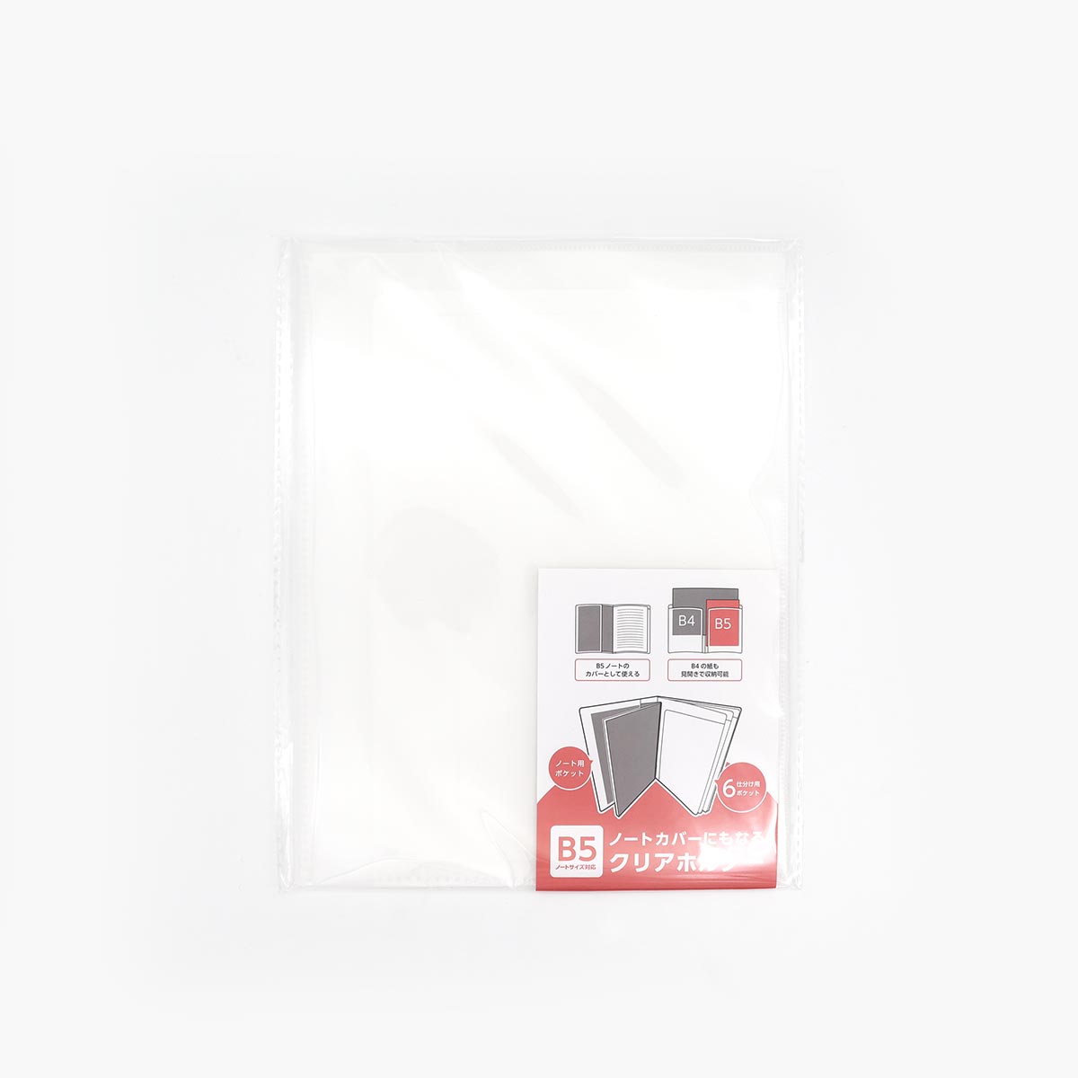B5サイズのノートカバーとしても使えるクリアホルダーです。仕分け用のポケットが6ポケット付き、またB5だけでなくB4も見開きで収納可能です。