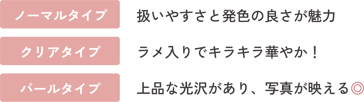 質感も、ノーマルタイプ/クリアタイプ/パールタイプ の3 種から選べるので、