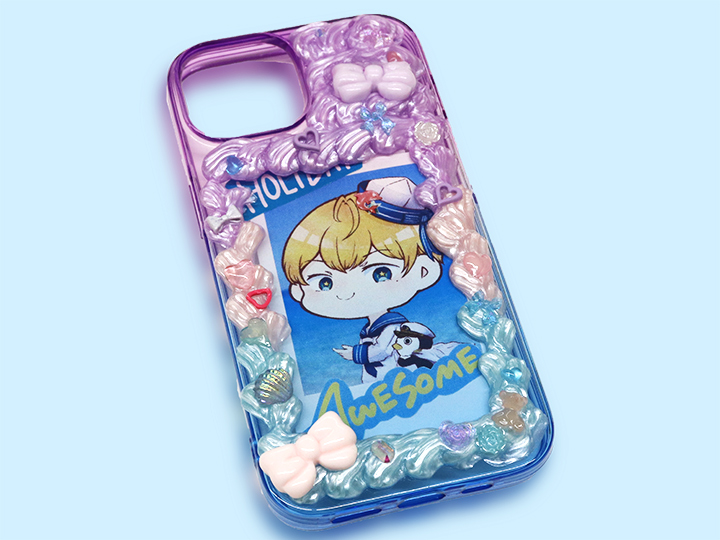 透明なスマホケースの外側にホイップを絞って「推し仕様」に♪