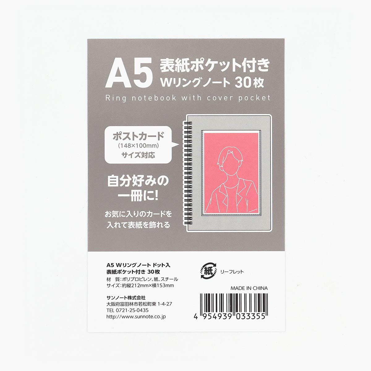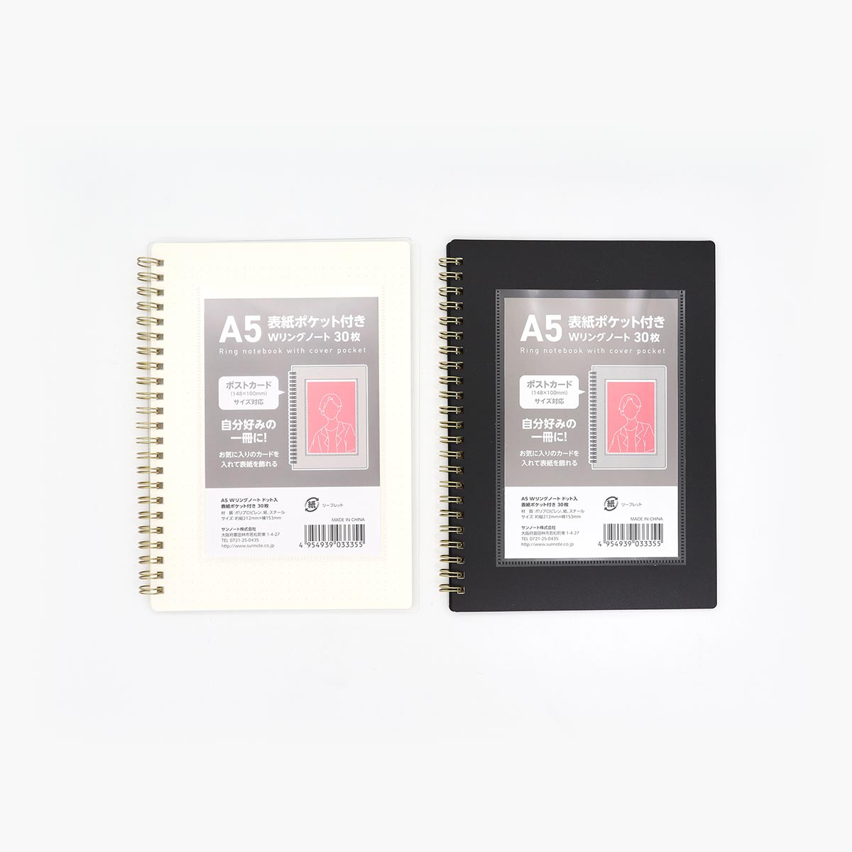 表紙に、ポストカードサイズ(縦148mm×横100mmまで)のカードを入れられるポケットが付いたA5サイズのWリングノートです。