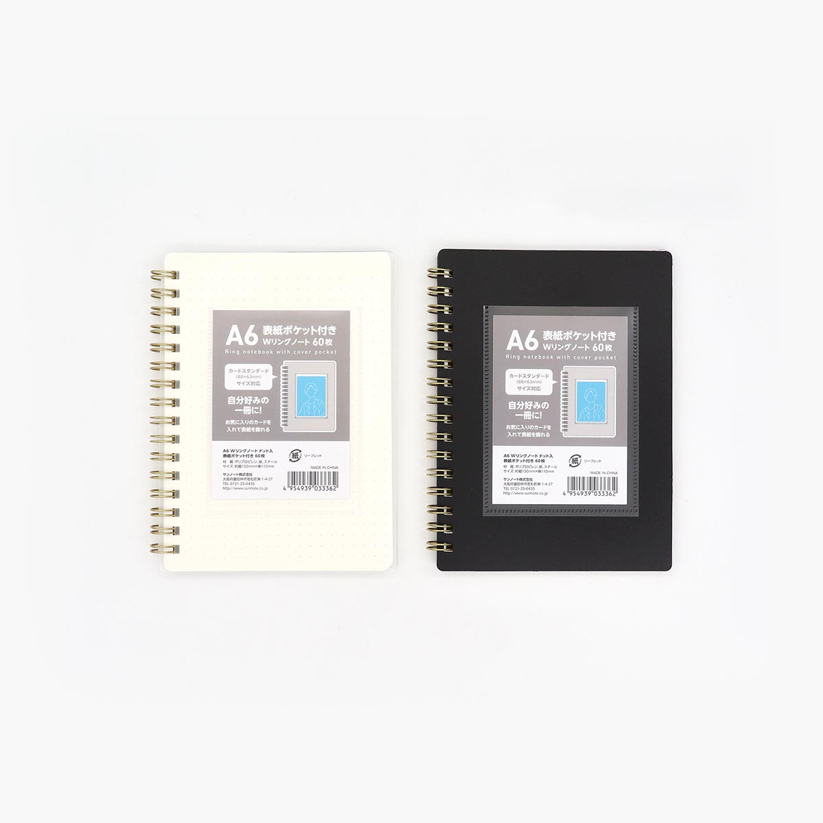 表紙に、スタンダードサイズ(縦88mm×横63mmまで)のカードを入れられるポケットが付いたA6サイズのWリングノートです。