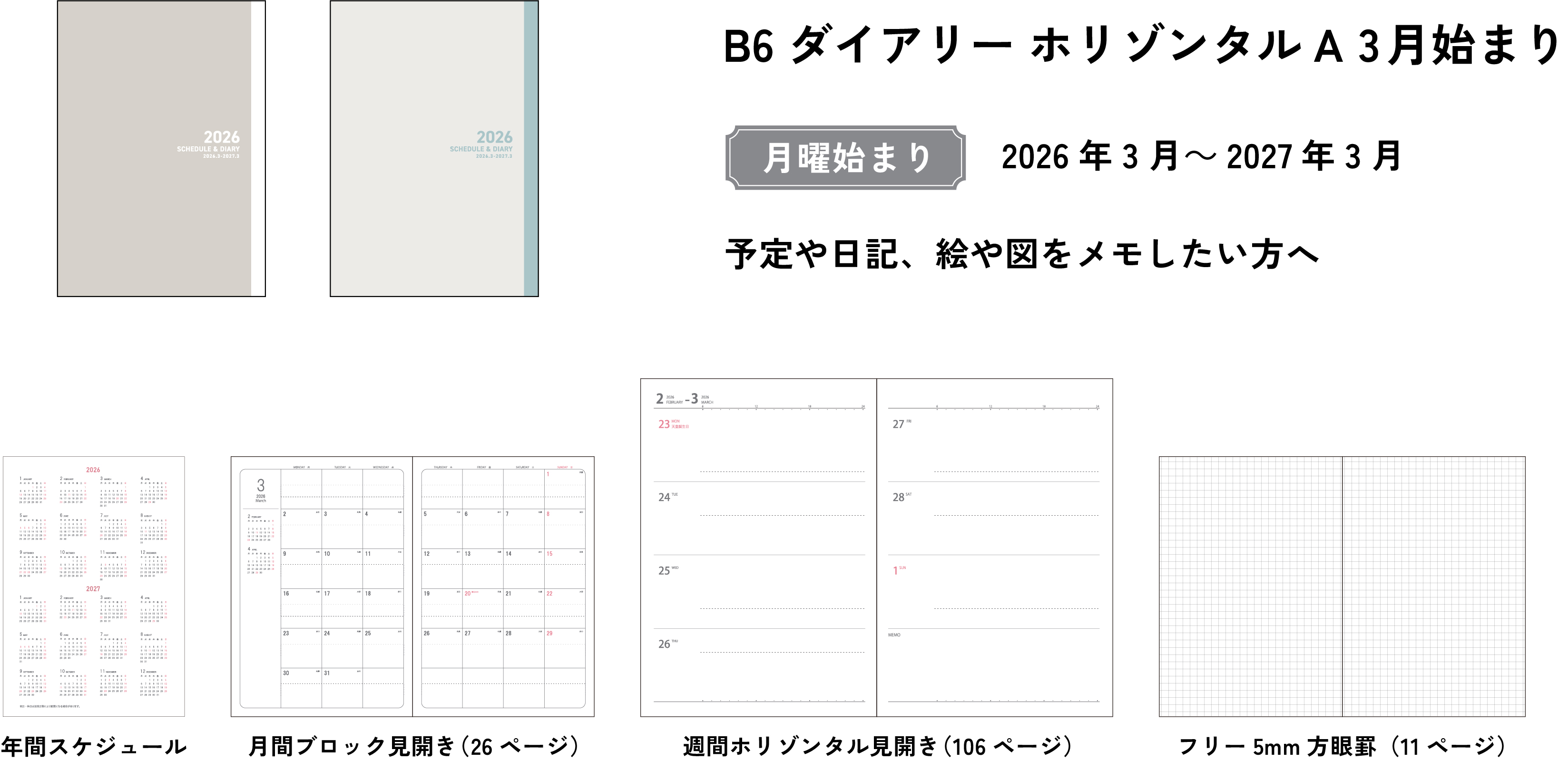 B6 ダイアリー ホリゾンタルA 2026 3 月始まり